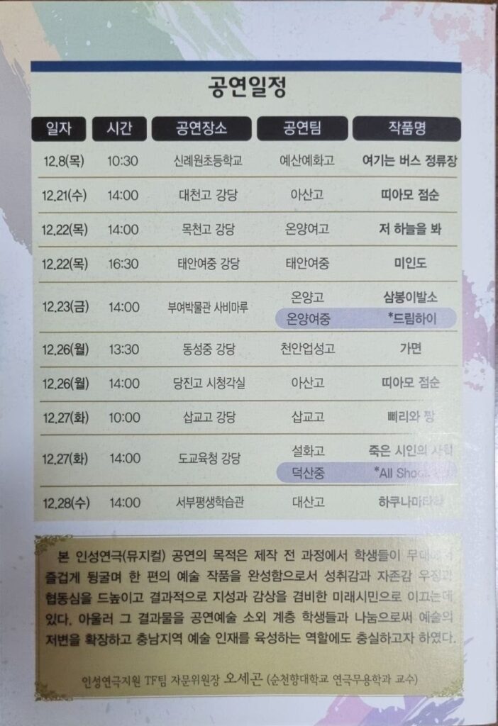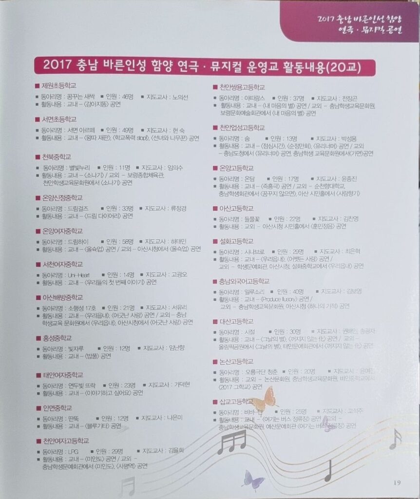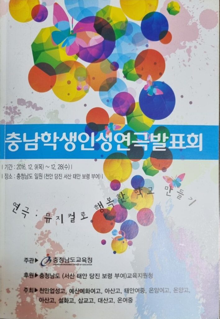 이듬해 2017년에는 ‘충남바른인성함양 연극·뮤지컬 발표회’3)가 개최되며 천안, 아산, 금산, 논산, 보령, 태안 등 6개 권역 합동 발표회로 발전했다. 이 행사는 지역 청소년 문화예술의 ‘분권화’를 시도한 첫 사례이기도 하다.
