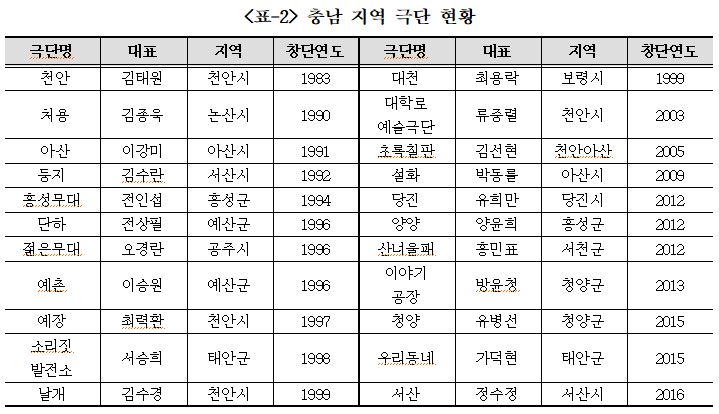 이승원은 충남 연극사에서 2021년 당시 충남 지역 극단 현황<표-2>을 다음과 같이 정리하였다.7)