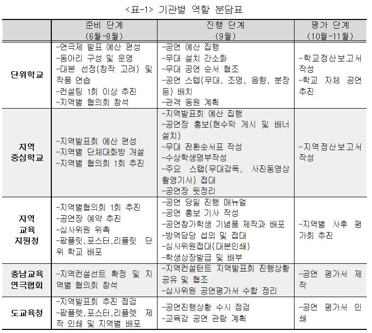 충남학생연극축제의 효율적인 운영을 위해 각 기관과 단체를 <표-1>과 같이 역할을 분담하였다.