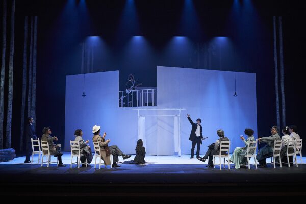 1층의 오케스트라 피트 주변에 니나(이다해 분)를 제외한 나머지 등장인물들 모두 나와서 움직임 없이 앉아 있다. 이들의 시선은 완전히 엇갈려서 서로 마주 보는 인물들이 없다. 마샤(박선혜 분)와 메드베젠코(김태균 분)는 첫 대사를 위해 오케스트라 피트에서 일어나 움직이며, 다른 인물들은 연극 공연을 위해 모두 퇴장해달라는 뜨레플레프의 요청을 받고서야 일어나 무대 뒤로 퇴장한다. 이러한 서사극적 연출을 통해 이 공연이 몰입이 아닌 무대와 객석 간의 객관적 거리를 의도했으며, 인물 간 엇갈린 관계를 시각적으로 표현했다는 것을 확인하게 된다. 그렇기에 도른(문창완 분)의 “어째서 모두가 이렇게 예민할까! 왜들 이렇게 다 예민해! 세상에 사랑이 왜 이리도 많아. 저 호수가 사랑의 마법이라도 부렸나 보다.”라는 대사의 의미가 잘 살아난다. 마법의 호수에 취한 인물들은 현실감각을 잃어버리고, 감정에 휘둘리며, 소통되지 않는 관계에 매달린다.