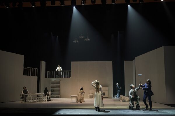 흰 장코트를 입은 뜨레플레프의 전자기타 연주로 시작된 극단 백수광부 <갈매기>와 유사한 인트로이지만 이층 무대로 인해 완전히 다른 의미를 제시한다. 사실적이면서도 상징적인 이층 무대는 공연의 콘셉트를 살리는데 매우 효과적이다. 2층으로 확장된 무대는 상하의 높이감으로 다양한 인물들의 엇갈린 애정 관계를 엇갈린 시선으로 포착하여 인물 간의 관계성을 분명하게 보여준다. 층간의 물리적 거리감은 심리적 거리감으로 환치된다. 이층에 존재하는 뜨레플레프와 아래층에 존재하는 인물들과의 물리적 거리는 뜨레플레프의 심리적 거리감을 상징하기에 그의 소외와 고독이 강조된다. 그만이 2층에 위치하는 것도 현실을 딛고 있지 않는 불안정성을 은유한다. 그리고 극적 공간은 호숫가 공연장에서 영지의 실내 공간, 뜨레플레프의 작업실로 이동하는데, 빠른 무대전환으로 완벽하게 구분되는 공간성을 보여준다. 흰색으로 통일된 무대세트는 스크린의 역할도 수행하여 조명 각도에 따라 인물들의 그림자가 일렁인다. 계속 변화하는 그림자의 크기와 움직임은 인물들의 불안정한 내면을 상징한다. 이번 공연처럼 무대의 의미가 강조되는 경우가 많지 않기에 참으로 흥미로웠다.