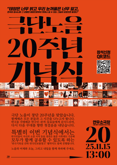 극단 노을이 창단 20주년을 맞이했다. 연극의 생활화, 철저한 분석, 정확한 표현, 분명한 전달, 재미와 감동을 극단의 방향성으로 삼았던 극단 노을은 60여 회의 공연 창작, 다양한 주제의 강좌, 워크숍 등을 주관, 개최하며 현실의 경계를 넘어 예술의 본질을 탐색해 왔다. 지난 11월 15일 연우 소극장에서는 극단 노을 20주년 기념식이 진행되었고, 20년의 세월의 무게를 딛고 ‘연극 공동체 노을’을 통해 한층 더 체계적인 활동을 이어가겠다고 선언했다. 잘 알려진 아프리카의 속담에 ‘혼자 가면 빨리 가지만, 함께 가면 멀리 갈 수 있다.’라는 말이 있다. 속도는 방향을 보장하지 않고 질주는 지속할 수 없다. 연극 공동체는 ‘동행(同行)’의 선언이다. 혼자 가는 길은 빠르지만 취약하고, 함께 가는 길은 느리지만 단단하다. 예술 하기 힘들고 어려운 시대에서 ‘함께 하는 것’, ‘곁을 지치는 것’, ‘끝까지 동행하는 것’은 단순하지만, 해답이 될 수 있다. ‘함께’라는 말 속에는 삶과 공동체, 인간의 본질에 대한 성찰이 담겨 있으며, 이는 곧 책임과 나눔, 연대와 공감이다.