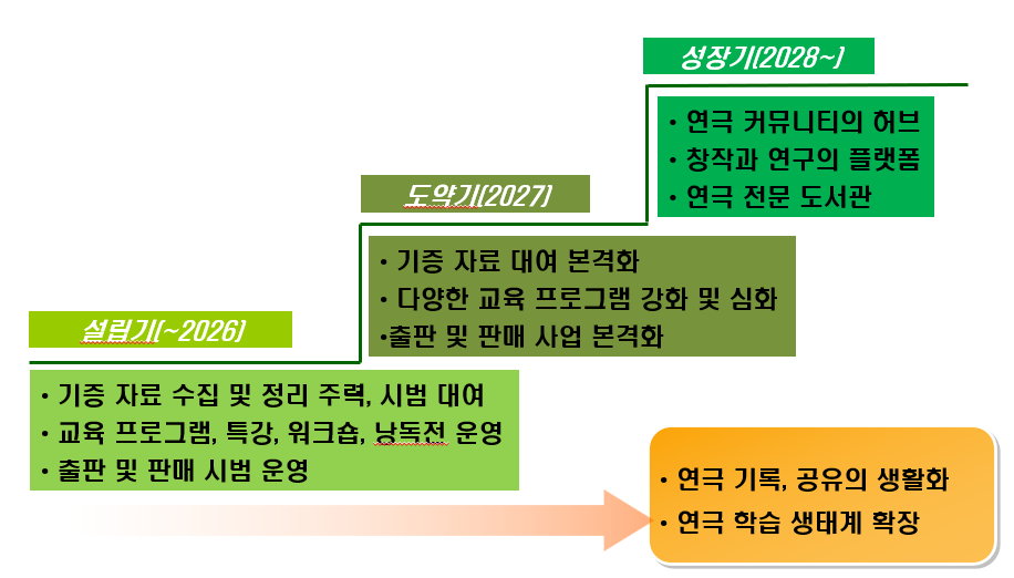 어떤 일이든 터를 잡고 뿌리를 내리려면 시간과 노력이 필요한 것처럼 ‘연극인보물창고’가 자리를 잡으려면 일정 시간이 필요하다. 창고지기 황윤동은 3개년 계획을 세워 차근차근, 그렇지만 쉼 없이 창고의 터 다지기에 힘을 쏟을 계획이라고 말한다. 첫해인 2026년에는 기증 자료의 수집에 주력하되 정리작업에 자원 봉사하는 연극인을 대상으로 대여 활동도 시범 운영할 예정이다. 더불어 교육프로그램, 분야별 워크숍, 전문인 또는 일반인을 위한 특강을 진행하고, 낭독전과 함께 출판 및 판매 사업도 시범 운영할 예정이다. 2027년에는 기증 자료를 중심으로 대여 활동을 본격화할 예정이고, 2026년 시범 운영한 사업을 본격화하고 각종 교육프로그램을 확장, 심화 운영할 예정이다. 이러한 과정을 거쳐 2028년에는 ‘연극인보물창고’가 명실상부 연극 전문 도서관, 연극 커뮤니티의 허브, 창작과 연구의 플랫폼, 연극인 사랑방 역할을 할 수 있게 할 예정이다.