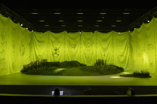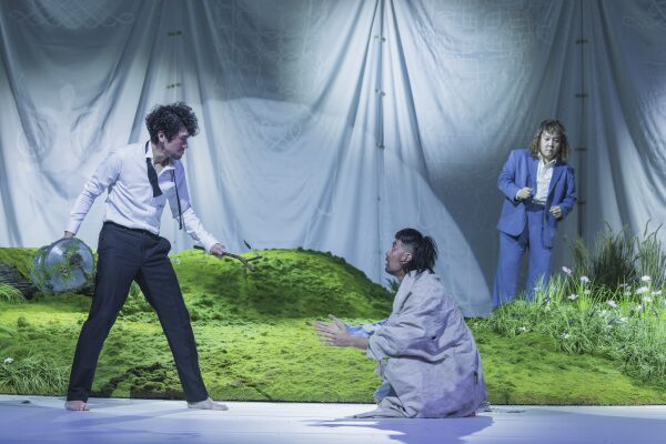 팜플렛은 이렇게 말한다. “무대는 폭풍의 잔해가 아니라, 새로운 이해와 관계가 태어나는 자리로 변모”할 것이다. 과연 그런가? 걷기 불편하고 움직임을 제한하는 이 초록 동산은 배우에게 어떤 “새로운 이해와 관계”도 제공하지 못한다. 무대는 미적 가치 못지않게 배우 연기의 원활함도 중시해야 한다. 초록 동산은 배우의 몸을 구속하고 방해한다. 동선도 가로막고, 멀뚱멀뚱 서있게 만든다. 배우의 자유로운 움직임을 보장하지 못하는 저 울퉁불퉁한 경사가 “듬성듬성 풀이 자라는 황무지 같은 이 섬”을 “사랑이 꽃피는 낙원”으로 변신시켜줄 거 같지는 않다. 경직되고 억제된 배우의 몸에서 사랑은 피어날 수 없다.