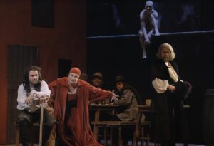 앞 열 왼쪽에 지팡이를 짚고 있는 남자가 3막의 결투로 다친 주인공 루프레히트고 붉은 옷이 악마 메피스토펠레스 그리고 우측에 모자를 들고 서 있는 사람이 파우스트다. 재미있는 건 파우스트와 메피스토펠레스가 오페라의 주연인 루프레히트에게 조언하는 역할의 조연이라는 점이다. 가장 높은 남성 성부인 테너가 맡는 악마 메피스토펠레스는 ‘세상천지 남자들은 늘 술에 취해 여자 뒤나 쫓지’라며 비아냥거리고, 가장 낮은 성부인 베이스가 부르는 학자 파우스트는 ‘행복은 돈으로 살 수 없고, 사랑은 힘으로 얻을 수 없지’라는 묵직한 조언을 던진다. 이 지점에서 프로코피예프의 음악적 연출이 반짝인다.