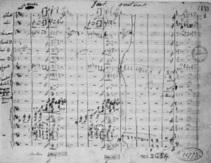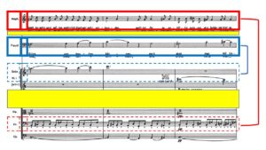 높은 음자리표에서 테너가 부르는 메피스토펠레스(빨간 실선 박스)는 8분음표로 잔망스럽게 노닐고, 낮은 음자리표의 베이스가 부르는 파우스트(파란 실선 박스)는 2분음표와 4분음표로 묵직하게 이어진다. 재미있는 건 높은 테너의 음형을 따라가며 반주하는 악기가 저음 첼로(빨간 점선 박스)의 스타카티시모(Staccatissimo; 원음 길이의 1/4로 짧게 끊어 연주하는 기법, Staccato의 1/2)고, 낮은 베이스의 반주는 가장 고음을 맞는 제1 바이올린 독주(파란 점선 박스)라는 점이다.