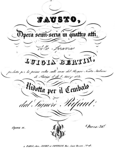 1830년에 완성된 오페라 ‘Fausto’는 그녀가 21살 때부터 이탈리아어로 대본을 써서 완성한 opera semiseria(심각한 내용을 다루는 opera seria보다는 덜 심각한 오페라 형식)다. 1831년, 무려 5년에 걸쳐 완성된 베르탱의 오페라 파우스토는 겨우 초연을 올리지만, 고작 3회 공연이라는 쓰라린 패배를 맛보게 된다.