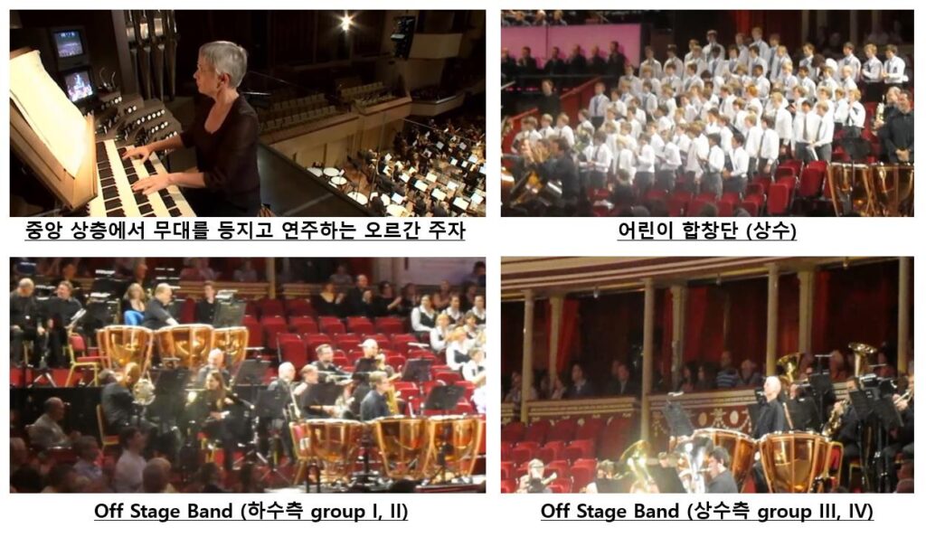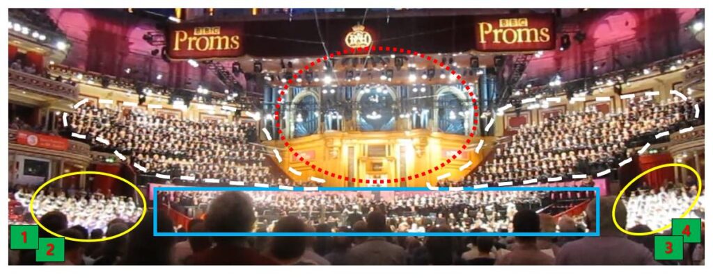 2011년 PROMS 실황 공연 사진인데, 연주 규모가 너무 커서 한 장에 담기조차 힘들다. 양측으로 펼쳐진 날개(흰 점선) 구역이 4그룹의 혼성 합창단이고, 그 아래쪽 노란 실선의 타원이 두 그룹으로 나뉜 어린이 합창단이다. 중앙의 빨간 점선이 파이프 오르간이고 하단 파란색 박스 구역이 네 명의 독창자와 지휘자 그리고 200여 명이 넘는 오케스트라가 자리한 곳이다. 사진 아래쪽 구석에 표시된 붉은 숫자는 off-stage band(금관+팀파니)가 있는 곳으로 사진에서는 잘려 잘 보이지 않는다. 아래는 각 구역을 확대한 사진이다.
